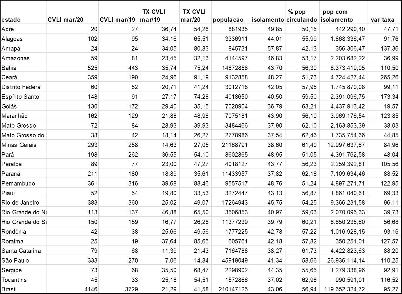 A tabela abaixo faz apenas um exercício teórico, para ilustrarmos o ponto. Ela traz os números absolutos de CVLIs em março de 2019 e 2020, a população em março de 2019 e a estimativa de população circulando em cada Estado em março de 2020, com base na taxa de isolamento social calculada pela InLoco, a partir da base de telefones celulares.